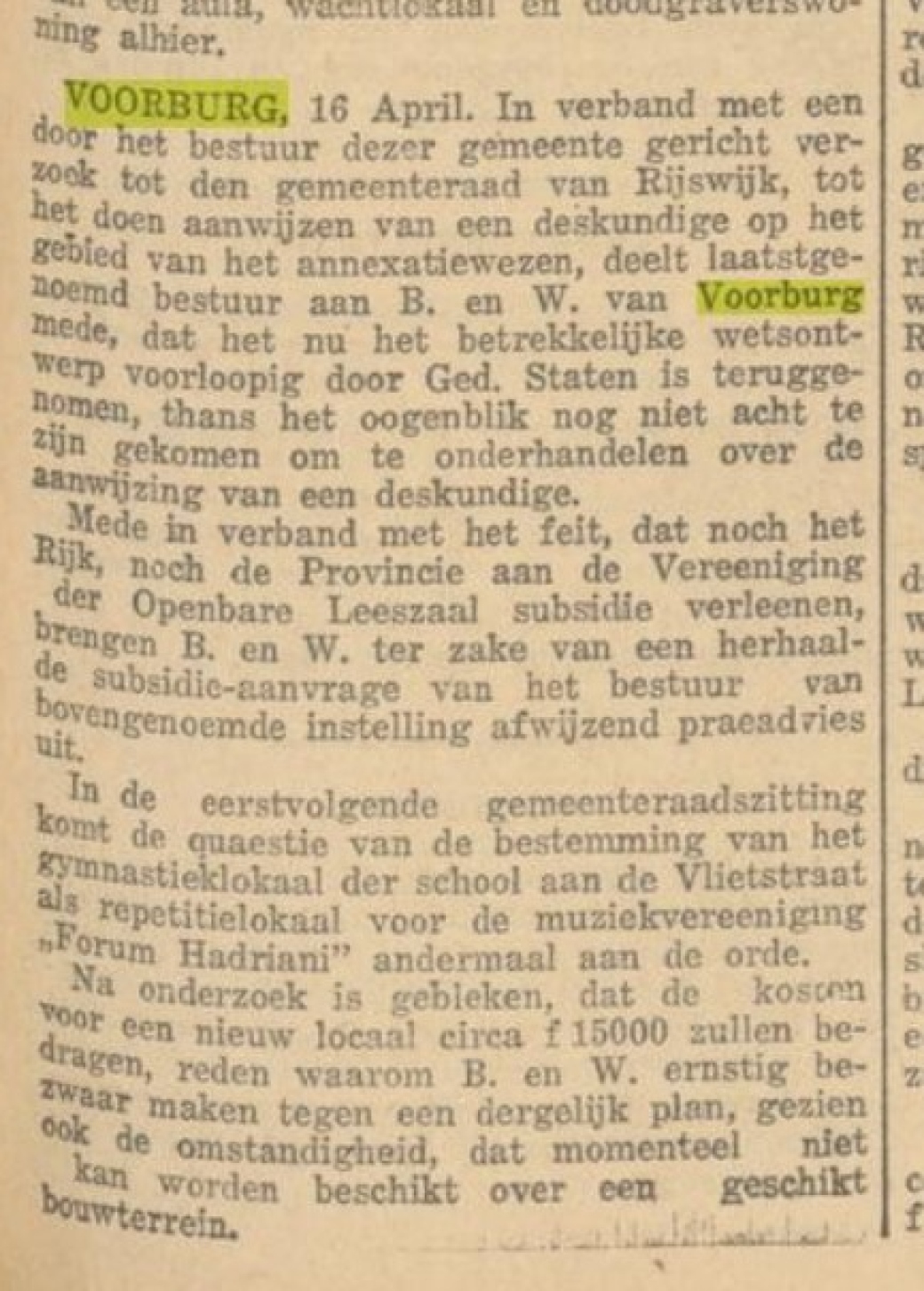 Ook vroeger gebeurde dat. Zo blijkt uit bijgaand krantenbericht. Opnieuw had Den Haag aangegeven dat de gemeente dringend behoefte had aan gebiedsuitbreiding. Annexatie van de gemeenten Rijswijk en Voorburg was in de ogen van Den Haag een voor de hand liggende oplossing. Voorburg had voorgesteld om een deskundige in te schakelen, waarschijnlijk om goede tegenargumenten aan te dragen, maar buurgemeente Rijswijk meende dat die stap nog niet aan de orde was, omdat Gedeputeerde Staten van Zuid-Holland het betreffende wetsontwerp al had teruggetrokken. De kosten van een externe adviseur kon de gemeente Voorburg zich op dat moment in ieder geval besparen.