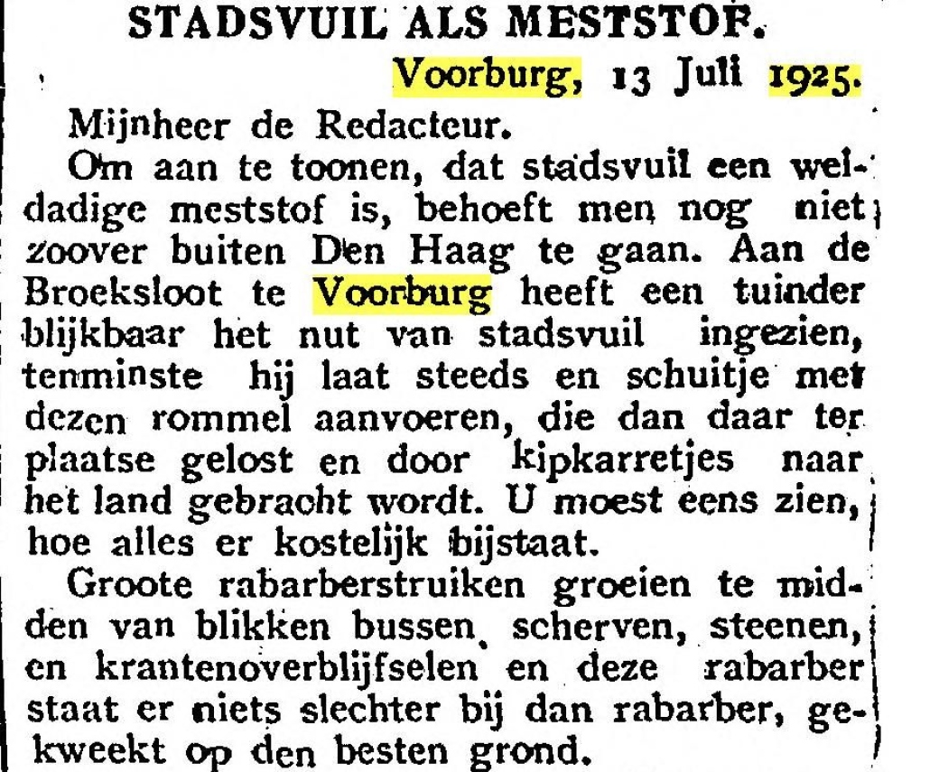 100 jaar geleden was er echter tenminste één Voorburger die wel initiatieven ondernam. Bijgaand bericht geeft aan dat stadsvuil wel degelijk nuttig kan zijn: een weldadige meststof, al was het maar voor de teelt van rabarber. Natuurlijk is rabarber een makkelijke plant, groeit haast overal, maar blijkbaar ook op een bed van stadsvuil. Wel rijst de vraag hoe stevig het schoeisel van de tuinder moest zijn om de oogst binnen te halen temidden van blikken bussen, scherven en stenen. Ook wordt niet duidelijk of er ook andere groenten geteeld konden worden. Tenslotte geeft deze ingezonden brief niet aan of er verdere ontwikkelingskansen waren. Kortom, een mooi initiatief, maar levensvatbaarheid op grotere schaal zeer onzeker!
