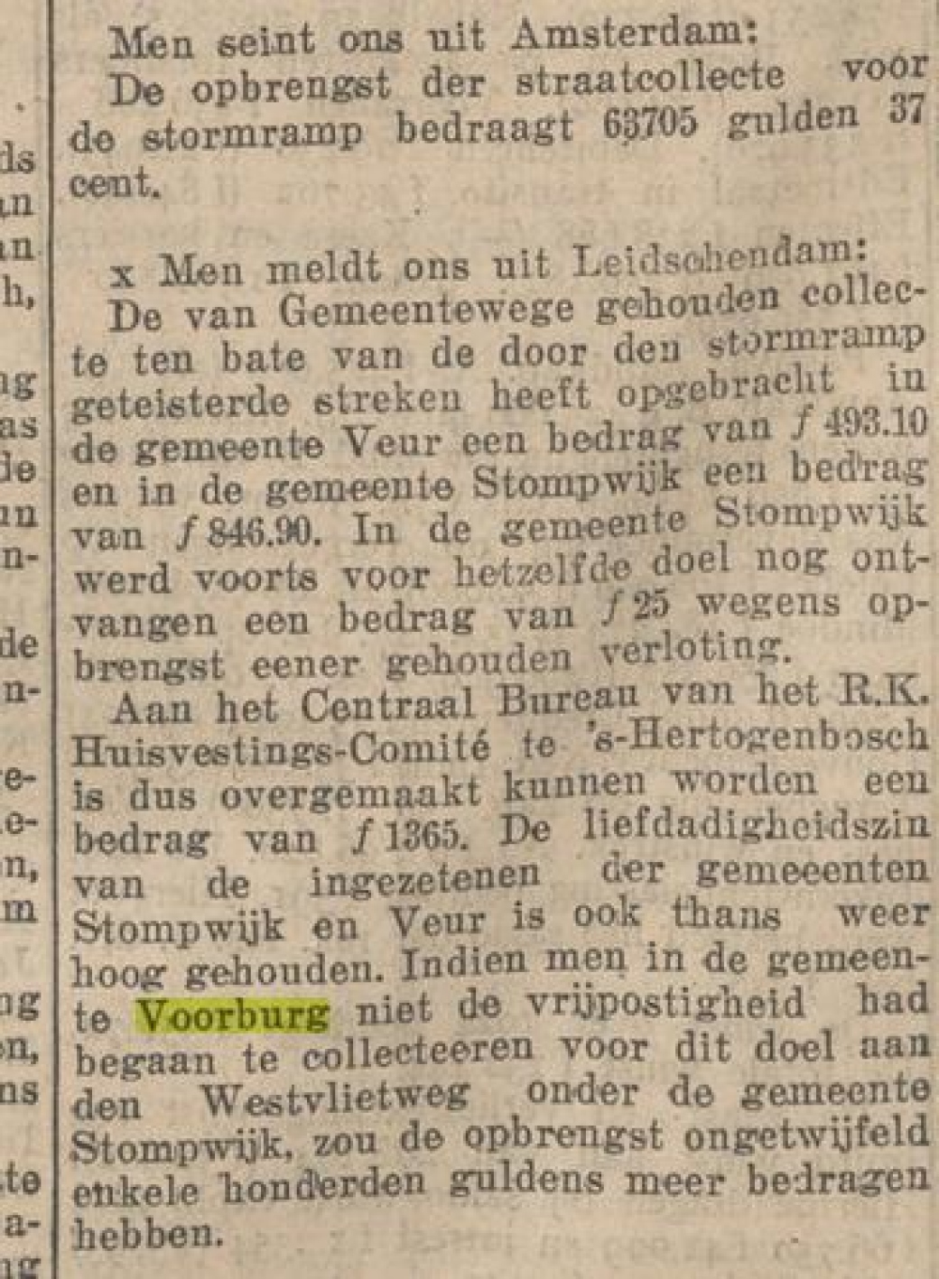 Ook al was er nog geen TV,ook toen werd er direct een nationale inzamelingsactie gestart om de mensen in het getroffen gebied te helpen. Zoals uit bijgaand artikel blijkt, gebeurde dat ook in Veur, Stompwijk, en Voorburg. Niet zonder reden wordt trots vermeld welk bedrag (1365 gulden – komt overeen met ongeveer € 13 500 nu) ingezameld werd en overgemaakt aan het R.K. (de maatschappij was nog echt verzuild) Huisvestings-Comité in ’s Hertogenbosch.